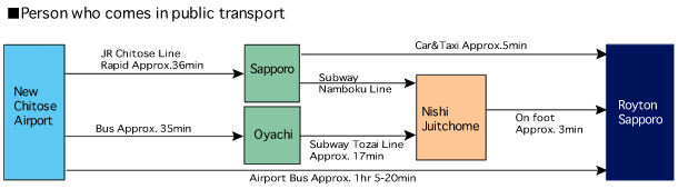 ■BUS Airport shuttle from New Chitose Airport to the hotel(approx. 80min.) →The departure time from New Chitose Airport is this ■JR Rapid Train via Chitose Line to Sapporo Station (approx. 36min.) 5minutes taxi ride from JR Sapporo Station ■Subway From Sapporo Station to Odori Station via Nanboku Subway Line; then via Tozai Subway Line to Nishi-Juitchome Station 3 minutes walk from Exit1. |