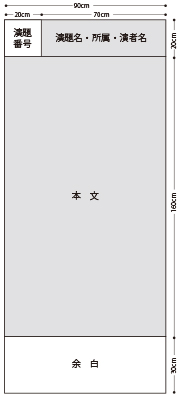 2m離れても判読できるよう見やすくし、文字や図表も十分読み取れる大きさにしてください(スライド印刷の場合、B4 以上の大きさを原則)。 - 演題番号(20 cm×20 cm)は学術集会側で準備します。こちらのスペースには貼らないでください。